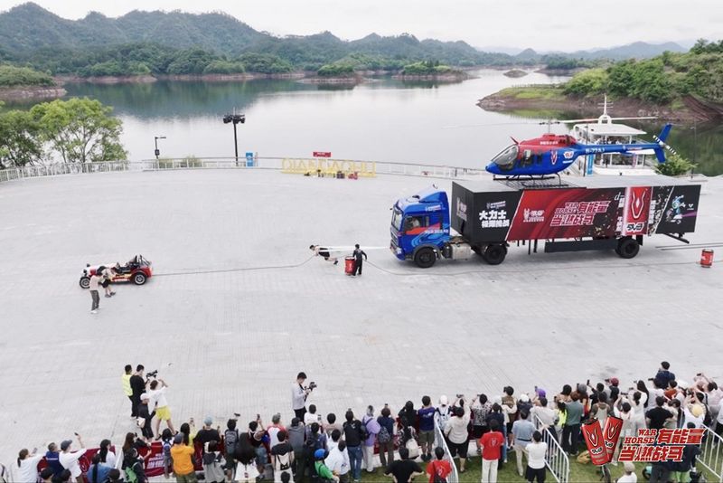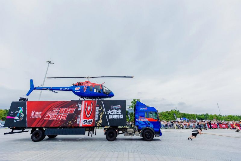 此次挑战创新采用“12米加长集装箱货车与贝尔505直升机”组成18吨复合体,打造飞行与力量的双重考验,第一重挑战由华彬航空总飞行师曹威以精湛驾驶技术,克服风力与气流扰动,将直升机精准降落在仅宽2.5米的货车箱体顶部,完成复合载体的组合。第二重挑战:大力士吴进松仅凭一条背拉绳索,依靠身体力量,奋力将总重达18吨的载机货车平行拖动了20米,两人出色的完成了接力任务,战马大力士极限挑战成功。