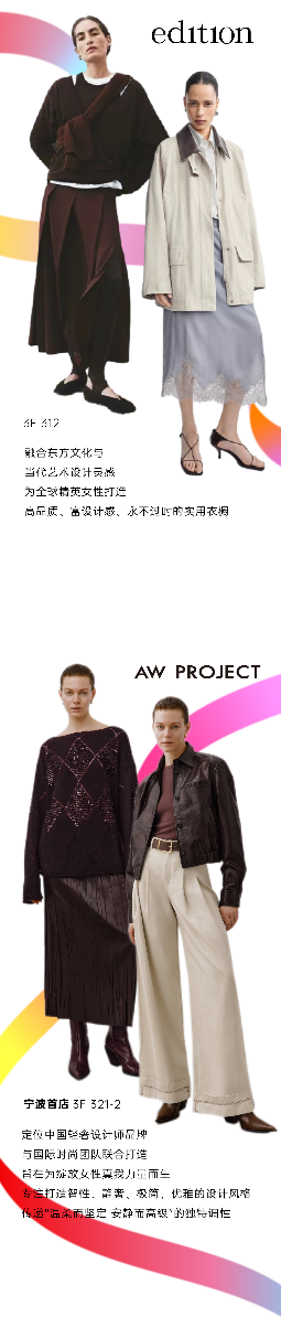融合东方文化与当代艺术设计灵感,为全球精英女性打造的ed1tion;以及传递“温柔而坚定 安静而高级"的独特调性的AW PROJECT;打破传统的时尚规则,体现出自由与精致的ANN ANDELMAN;还有呈现出朴实与冷静的高级运动美学,兼具先锋与未来感的Y-3,共同呈现新品的多元风格舞台。