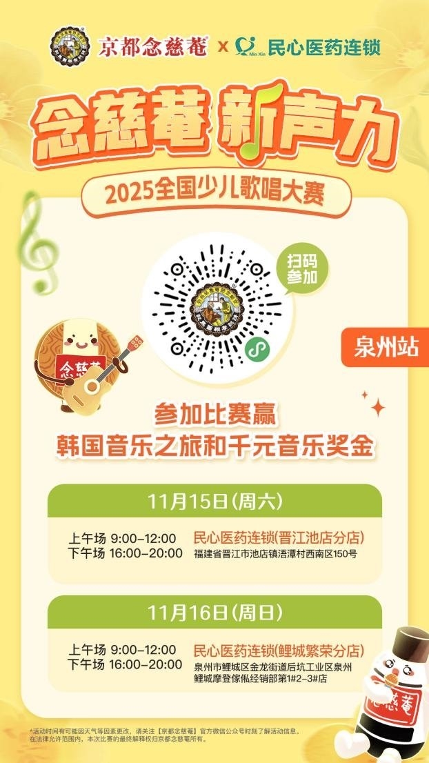“念慈菴·新声力”少儿歌唱大赛海选将在11月15日至16日来到惠州、泉州和佛山,让我们相约惠州、泉州和佛山,继续见证童声绽放的动人时刻,共同守护每个孩子的音乐梦想! 关注京都念慈菴微信公众号,了解更多相关信息,一同为音乐之星打call吧!